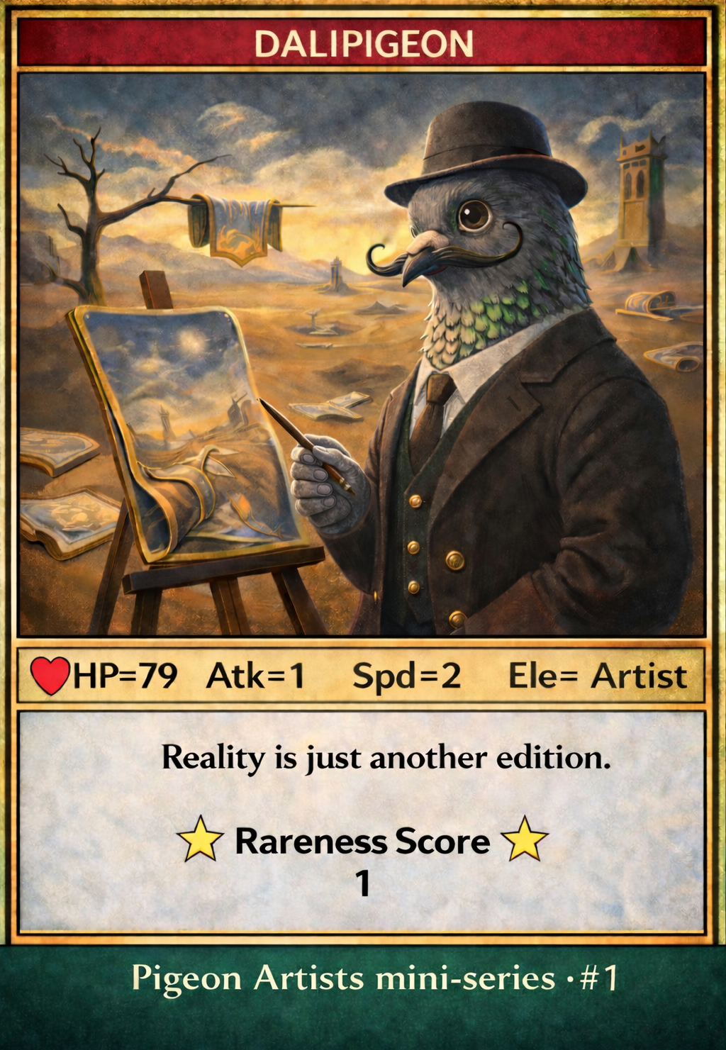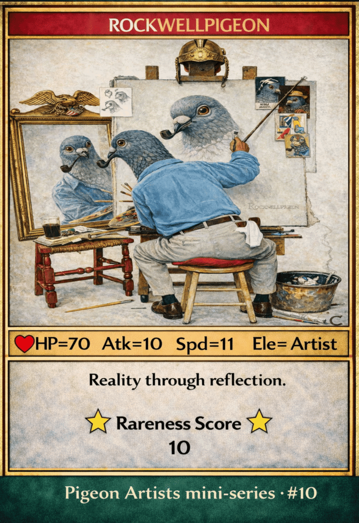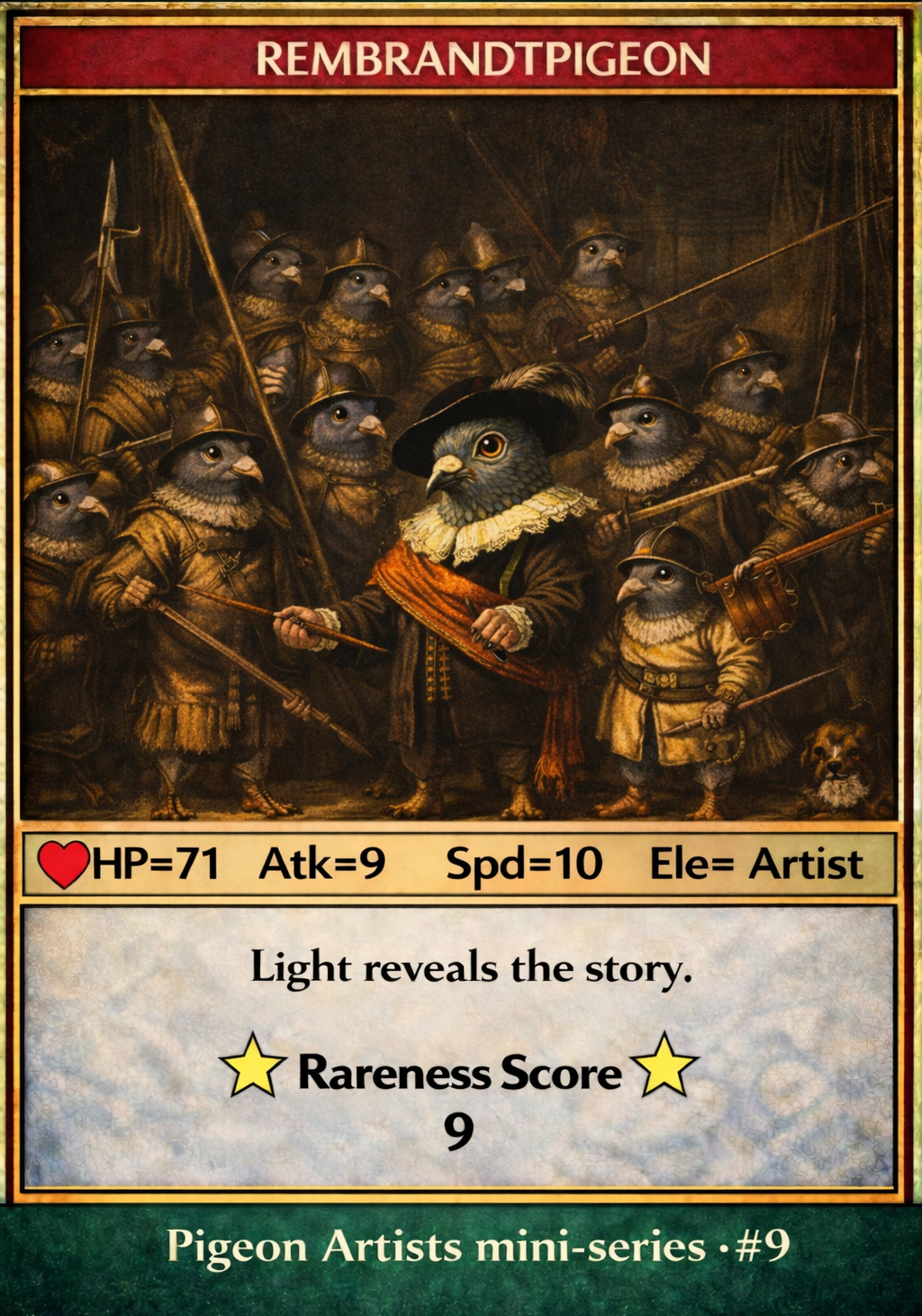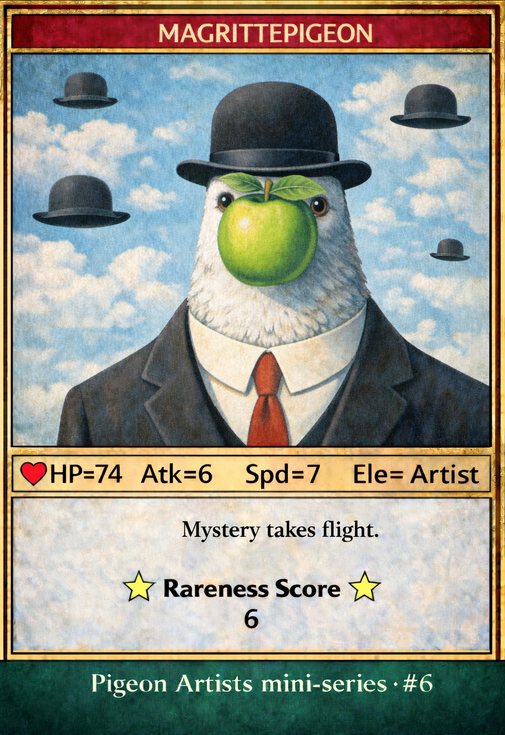 Each card in the series pays tribute to a specific artist, blending familiar artistic styles, references, and cultural symbols with the signature Rare Pigeons aesthetic. The result is a collectible set that connects classic art heritage with on-chain culture, memes, and contemporary digital collecting.