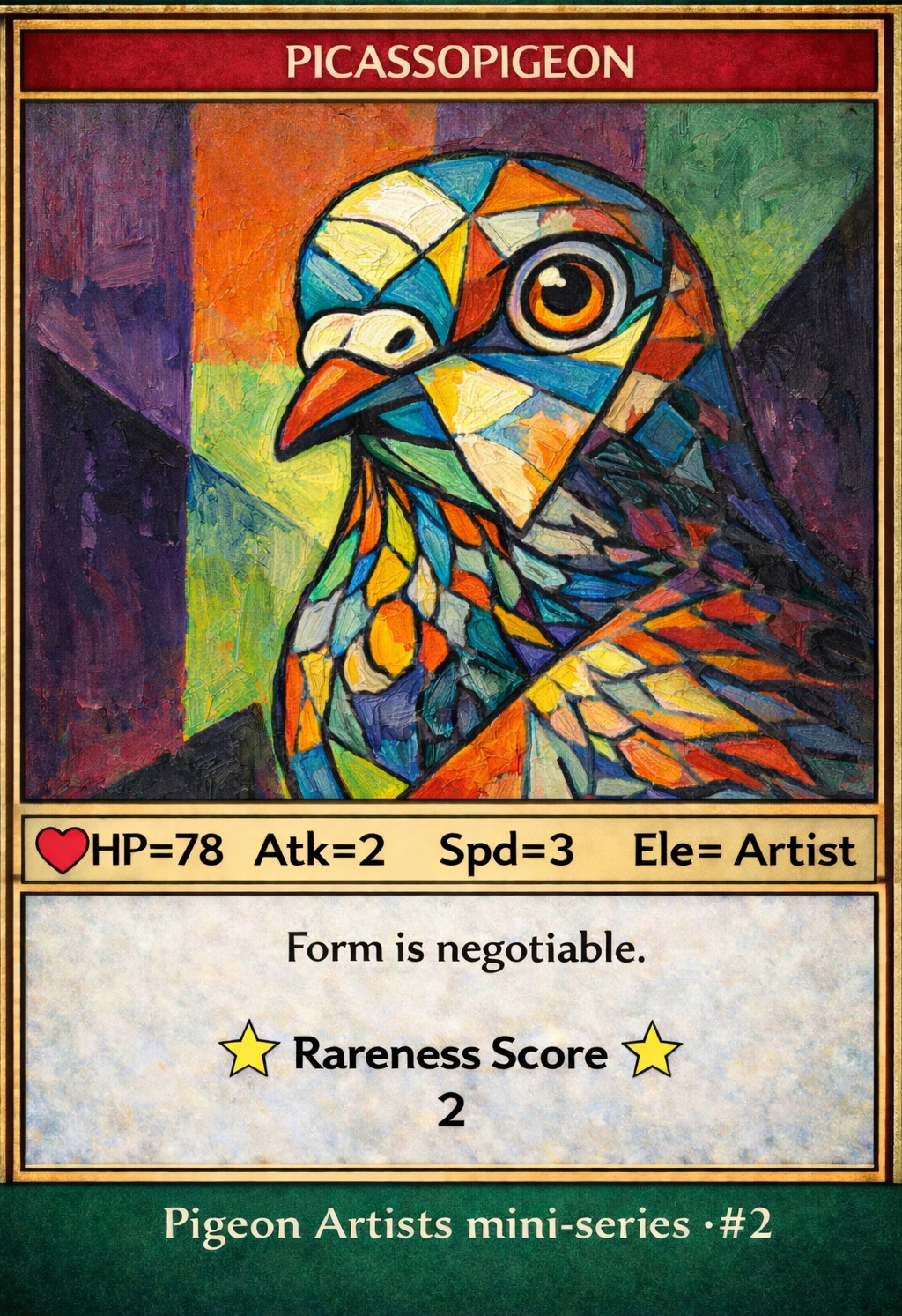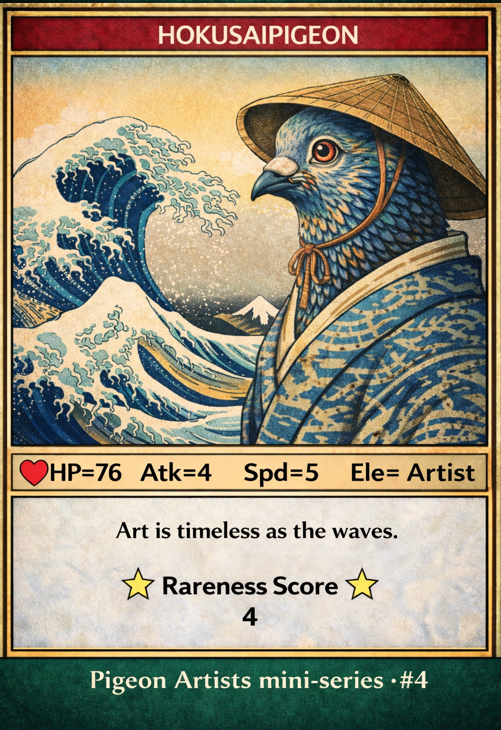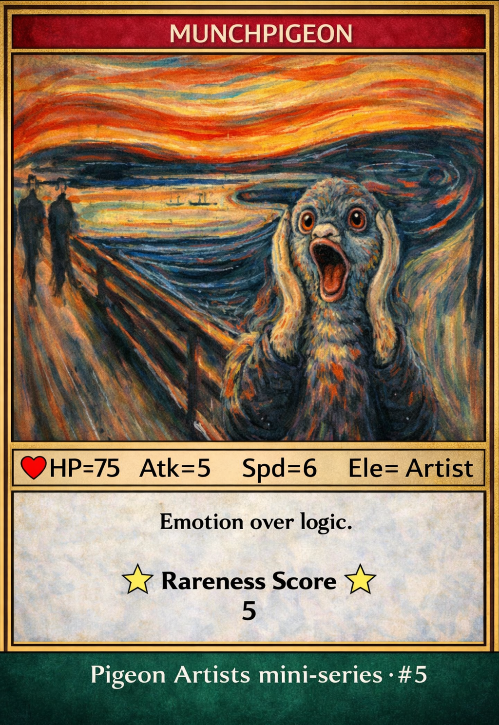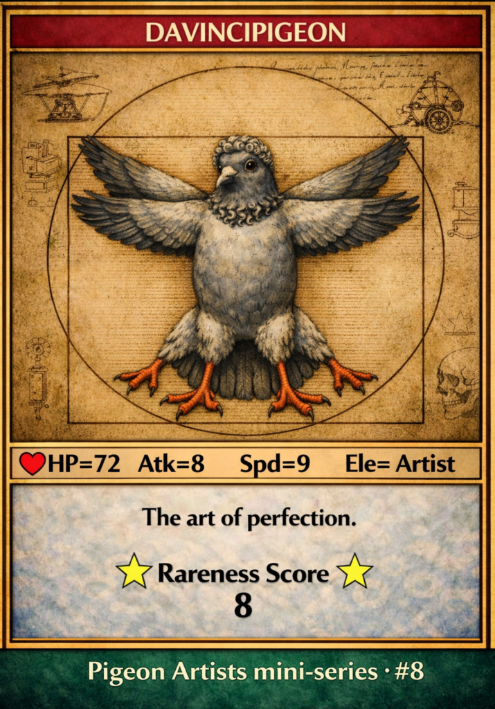 Each card in the series pays tribute to a specific artist, blending familiar artistic styles, references, and cultural symbols with the signature Rare Pigeons aesthetic. The result is a collectible set that connects classic art heritage with on-chain culture, memes, and contemporary digital collecting.